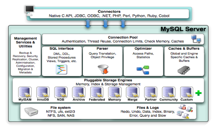 + - Pluggable Storage Engines:存储引擎接口,MySQL 区别于其他数据库的重要特点就是其存储引擎的架构模式是插件式的(存储引擎是基于表的,而不是数据库)